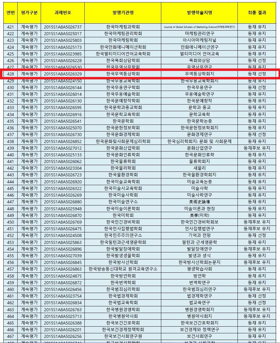 우리 학회는 2012년에 한국연구재단 「등재후보지」로 선정된 후, 교수님들의 관심과 훌륭한 논문의 투고가 이어졌습니다. 이러한 교수님들의 관심 덕분에 이번 2015년도 한국연구재단의 학술지평가에서 우리 학회가 발간하는 「무역통상학회지」가 한국연구재단 「등재지」로 선정되었습니다. 이 모든 것이 우리 학회 교수님들의 학회에 대한 사랑 때문이라고 생각합니다.