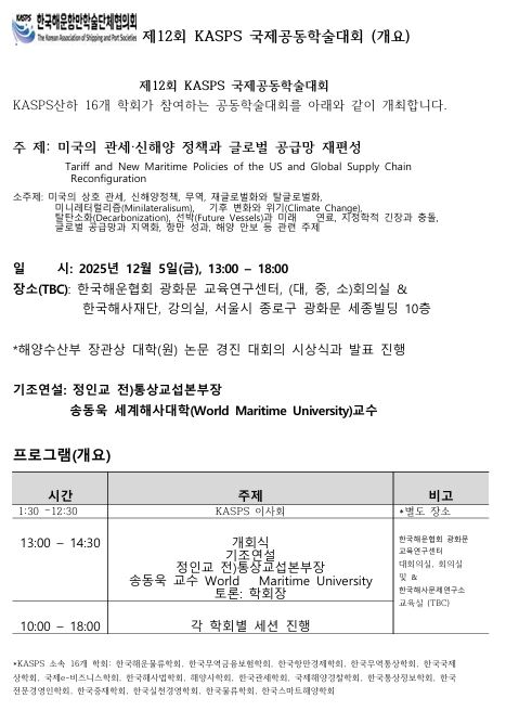 금번 12월 5일 금요일 한국해운협회 광화문 교육연구센터에서 제 12회 KASPS 국제공동학술대회를 개최 합니다.
